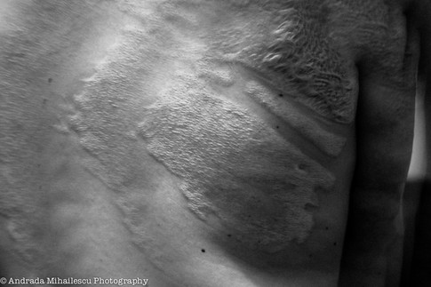 Corpul reparat spune un adevar, acela al adaptarii. Corpul reparat da dovada de forta si de capacitati extraordinare de reconstructie. Corpul devine un ansamblu de „piese de schimb” pentru „auto-reparare”. In ceea ce priveste cicatricile post-arsura, pielea se reface, acceptand transplant de tesut, care provine din alta parte a corpului. Eseul acesta doreste sa arate privitorului faptul ca cicatricile au o frumusete aparte, asemanatoare unor opere de arta. Vorbim aici despre o opera de arta a corpului, cladita pentru a se repara si recontrui. In cazul meu, grefele de piele de pe ceafa, umar stang, umar drept si mana dreapta, au fost preluate de pe zona coapselor. La formarea acestor cicatrici am contribuit in mod direct, am pus o parte din ceea ce sunt, atat la nivel fizic cat si psihic, pentru a finaliza lucrarea de arta pe care v-o prezint, astazi, aici si acum. Corpul meu este o harta iar cicatricile reprezinta conturul ei. Cele 13 imagini din acest eseu foto reprezinta auto-portrete, care imi apartin. Aceasta sunt eu, imperfecta, puternica, umana.